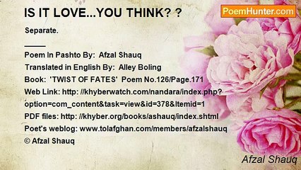 In the name of whom br I truly dedicating my poetry... br br Today... br Her voice recites my verse br She asked me br the meaning of my verse br not recognizing it was her address br amazingly... br br Poem In Pashto By: Afzal Shauq br Translated in English By: Alley Boling br Book: 'TWIST OF FATES' Poem No.202Page.268 br Web Link: http: khyberwatch.comnandaraindex.php? br option=comcontent&task=view&id=378&Itemid=1 br PDF files: http: khyber.orgbooksashauqindex.shtml br Poet's weblog: www.tolafghan.