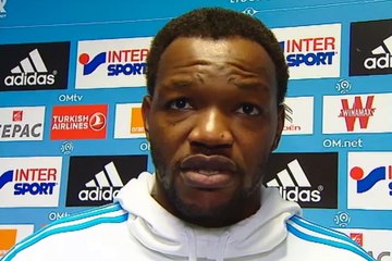 La réaction du capitaine et portier olympien, Steve Mandanda, après la victoire de l’OM face à l’AS Monaco, 2 buts à 1, au stade Vélodrome (Saison 2014-15 - Ligue 1 - 36e journée).