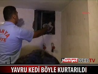 Bodrum ilçesinde tarihi su sarnıcına düşen yavru kedi, ekiplerin telefondan dinlettikleri kedi sesi ile havalandırma boşluğuna yönelince kurtarıldı. brbrbrMuğla 911 Arama ve Kurtarma Derneği ekipleri, Konacık Mahallesi Atatürk Bulvarı kenarında bulunan asırlık tarihi su sarnıcına bir kedinin düştüğü ve çıkamadığı ihbarı üzerine harekete geçti. Bölgeye gelen ekipler, asma kilitli kapıyı açmak için belediye ekiplerinden izin istedi.brbrBelediye zabıta ekiplerinin gözetiminde kapı kilidini kıran ekipler, içerisi eşyayla dolu sarnıçta bir süre kediyi aradı. Kedinin ses çıkartmaması üzerine dışarıya çıkan ve ses gelmesini bekleyen kurtarma ekipleri, bundan da sonuç alamayınca, çareyi telefondan kedi sesinin yer aldığı video açıp yavruya sesi dinletmekte buldu.brbrSarnıcın havalandırma boşluğundan dinletilen sesi duyan yavru kedi kapıya yöneldi. Annesinin de havalandırma boşluğundan içeriye girmesiyle dışarıya çıkan yavru kedi, ardından annesiyle bölgeden uzaklaştı.