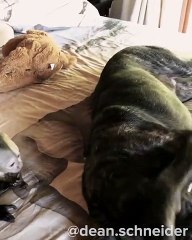 Un chien essaie de réveiller une truie