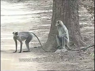 Yes, this Langur is an appointed security guard on duty to scare the notorious Macaques at Woodstock school in Landour, Uttarakhand. The Macaques of the area roam around uninvited and disturb the locals. As a serious measure taken to keep them away rather scare them form entering, this Langur is appointed. br br Gray langurs or Hanuman langurs, the most widespread langurs of South Asia, are a group of Old World monkeys constituting the entirety of the genus Semnopithecus. All taxa have traditionally been placed in the single species Semnopithecus entellus.[1] In 2001, it was recommended that several distinctive former subspecies should be given full species status, so that seven species are recognized. A taxonomic classification with fewer species has also been proposed. Genetic evidence suggests that the Nilgiri langur and purple-faced langur, which usually are placed in the genus Trachypithecus, actually belong in Semnopithecus. Gray langurs are large and fairly terrestrial, inhabiting forest, open lightly wooded habitats, and urban areas on the Indian subcontinent. Most species are found at low to moderate altitudes, but the Nepal gray langur and Kashmir gray langur occur up to 4,000 metres (13,000 ft) in the Himalayas.br br Landour a small cantonment town contiguous with Mussoorie, is about 35 km (22 mi) from the city of Dehradun in the northern state of Uttarakhand in India. The twin towns of Mussoorie and Landour, together, are a well-known British Raj-era hill station in northern India. Mussoorie-Landour was widely known as the "Queen of the Hills". The name Landour is drawn from Llanddowror, a village in Carmarthenshire in southwest Wales. During the Raj, it was common to give nostalgic English, Scottish, Welsh or Irish names to one's home (or even to British-founded towns), reflecting one's ethnicity. Names drawn from literary works were also common, as from those by Robert Burns, Walter Scott, Thomas Hardy, Robert Louis Stevenson and many others.br br Source - Wikipediabr br This footage is part of the professionally-shot broadcast stock footage archive of Wilderness Films India Ltd., the largest collection of imagery from South Asia. The Wilderness Films India collection comprises of thousands of hours of high quality broadcast imagery, mostly shot on HDCAM 1080i High Definition, HDV and XDCAM. Write to us for licensing this footage on a broadcast format, for use in your production! We are happy to be commissioned to film for you or else provide you with broadcast crewing and production solutions across South Asia. We pride ourselves in bringing the best of India and South Asia to the world... Reach us at wfi @ vsnl.com and admin@wildfilmsindia.com.