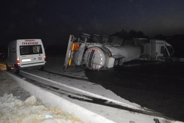 Nurhan İçmez br TOKAT (İHA) - Tokat’ta su yüklü tır yan yatarak diğer şeride geçti. Maddi hasarla atlatılan kazada yol tek taraflı olarak trafiğe kapandı. br Edinilen bilgiye göre; Tokat’ın Niksar ilçesinden yüklediği suyu Turhal ilçesine götüren Yılmaz P. İdaresindeki 60 NP 306 plakalı tır, sürücüsünün direksiyon hakimiyetini kaybetmesi sonucu karşı yöne geçti. D 850 Karakaya köyü yakınlarında yola yan yatarak sürüklenen tırın sürücüsü kazayı yara almadan atlattı. Devrilen tır taşıdığı su kolileri yola saçıldı. Duble yol tek taraflı olarak ulaşıma kapandı. Tırın kaldırılması için çalışma başlatıldı. Kazayı yara almadan atlatan Yılmaz P. Kazanın aracın lastiğinin patlaması sonucu meydana geldiğini ifade ederek, “Lastik patlayınca tır yan yattı. Ben kazayı yara almadan atlattım ama tırda hasar var. 26 ton su yüklü idi” diye konuştu.
