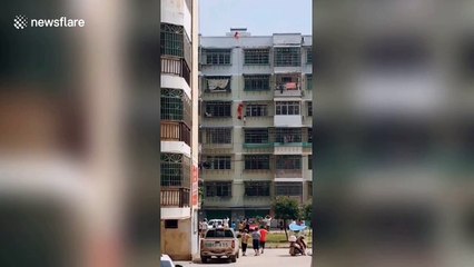 Firefighters rescued a boy hanging from the fourth-floor window of a residential building after his head got stuck in the security net in central China.br br In the clip, shot in Fangcheng county in Henan province on July 30, a man stood on the third-floor balcony to hold the boy hanging from the fourth-floor security net.br br Firefighters broke into the flat and tried to use a pair of shear pliers to tear down the security net. br br Finally, they took the boy back to safety and contacted his parents.