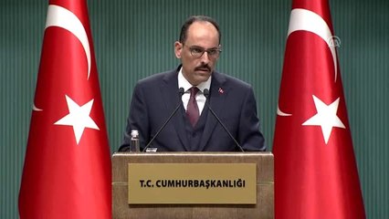 Cumhurbaşkanlığı Külliyesi Cumhurbaşkanlığı Kabine Toplantısı Cumhurbaşkanlığı Sözcüsü İbrahim Kalın'ın açıklamaları ANKARA - Cumhurbaşkanlığı Sözcüsü İbrahim Kalın, Cumhurbaşkanı Recep Tayyip Erdoğan başkanlığında Cumhurbaşkanlığı Külliyesi'nde yapılan Kabine Toplantısı devam ederken... br Cumhurbaşkanlığı Külliyesibr Cumhurbaşkanlığı Kabine Toplantısıbr Cumhurbaşkanlığı Sözcüsü İbrahim Kalın'ın açıklamalarıbr ANKARA - Cumhurbaşkanlığı Sözcüsü İbrahim Kalın, Cumhurbaşkanı Recep Tayyip Erdoğan başkanlığında Cumhurbaşkanlığı Külliyesi'nde yapılan Kabine Toplantısı devam ederken açıklamalarda bulundu, soruları cevapladı.br (7)brKalın: (Rusya ile İdlib görüşmeleri) Şu ana kadar müzakerelerden bizi tatmin edeci bir sonuç çıkmamıştır. Sunulan kağıdı ve haritayı kabul etmedik.