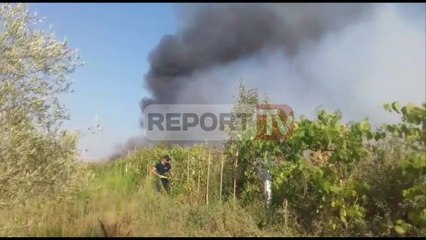 Report TV - Zjarr në magazinë në Patos! Shpërthen 'Benz'-i nga flakët, digjen pulat