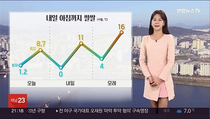 [날씨] 내일도 전국 매서운 추위…모레 낮부터 풀려br br 내일도 강추위가 예상됩니다.br br 특히 아침 기온은 오늘과 비슷하거나 더 낮은 곳도 있겠습니다.br br 내일 출근길 서울 영하 10도 보이겠고요, 한파경보가 발효 중인 강원도 대관령은 영하 18도까지도 곤두박질치겠습니다.br br 체감 추위는 이보다 더 심하겠고 낮에도 서울 1도에 그치는 등 찬바람이 계속되겠습니다.br br 한편 오늘 충청과 호남, 제주 산지에는 눈이 내렸습니다.br br 지금도 일부 서해안과 제주도 쪽에 눈발이 이어지고 있는데요.br br 전북 순창의 경우는 이미 15cm에 가까운 적설을 기록하고 있고요, 내일까지는 일부 지역이 눈구름의 영향을 받겠습니다.br br 오늘 밤사이 눈발이 약해지기는 하겠지만 앞으로 제주 산간에 최고 15cm 또 호남 서부에도 많게는 8cm의 큰 눈이 더 쏟아지겠고요.br br 호남 동부와 충남 서해안에는 1~5cm의 눈이 예상됩니다.br br 서울 등 그 밖의 지역은 내일도 하늘은 맑겠고요, 먼지 걱정도 없겠습니다.br br 다만 건조함이 심해졌습니다.br br 동해안 전역과 서울에도 건조주의보가 내려졌습니다.br br 내일까지 해안가 중심으로 강풍도 불겠습니다.br br 화재 사고에 더욱더 신경을 쓰셔야겠습니다.br br 내일 아침 기온은 서울이 영하 10도, 전주 영하 7도, 대구 영하 7도, 부산 영하 6도에서 시작하겠고요.br br 한낮 기온은 서울이 1도, 청주 1도, 대구 3도, 창원 4도에 그치겠습니다.br br 모레 낮부터 추위는 풀리겠고 당분간 하늘은 맑겠습니다.br br 날씨 전해드렸습니다.