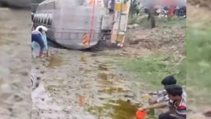 Edible oil tanker overturns on MUM-AMD Highway leading to spill; villagers rush to collect oil