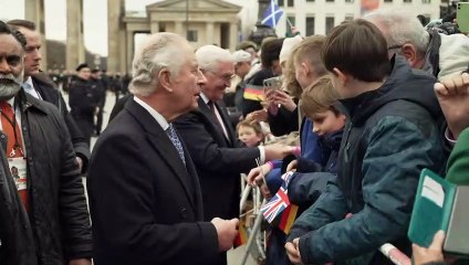 The King and Queen Consort shake hands with members of the public who have gathered outside the gates of Hillsborough Castle in County Down, Northern Ireland. Report by Lewisl.