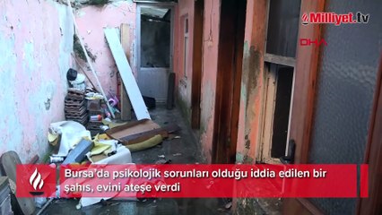 BURSA'da psikolojik sorunları olduğu iddia edilen Ali Ç, (43), tek katlı evini yaktı. br Yangın nedeniyle korkan mahalle halkının saldırdığı Ali Ç.'yi polis kurtardı.brOlay, saat.14.30 sıralarında Osmangazi İlçesi Zafer Mahallesi 9. Dicle Sokak'ta meydana geldi. İddiaya göre psikolojik sorunları bulunan Ali Ç., yaşadığı tek katlı evi ateşe verip kaçtı. Evden yükselen dumanları görenlerin ihbarıyla olay yerine sevk edilen itfaiye ekiplerince yangın kısa sürede söndürülürken, yapı kullanılamaz hale geldi. İtfaiye ekiplerinin soğutma işlemi sürerken, mahalleye geri dönen Ali Ç, "Evi ben yaktım" deyince mahalle halkından 3 kadının saldırısına uğradı. Kadınlar güçlükle sakinleştirilirken, Ali Ç., ifadesine başvurulmak üzere ekip otosuna bindirilerek polis merkezine götürüldü. Yangından kurtarılan bir köpeğe çevredekiler tarafından yemek verildi. Yangınla ilgili soruşturma sürüyor. Haberabr br hbrlr1.