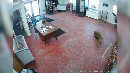 Security camera captures the moment a deer smashed through a window pane of a butcher's shop front door