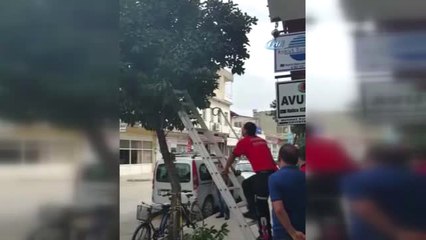 152 yıllık anıt ağaçta mahsur kalan kuş itfaiye ekipleri tarafından kurtarıldı