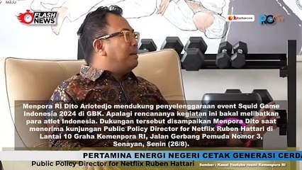 Menpora RI Dito Ariotedjo mendukung penyelenggaraan event Squid Game Indonesia 2024 di GBK. Apalagi rencananya kegiatan ini bakal melibatkan para atlet Indonesia. Dukungan tersebut disampaikan Menpora Dito saat menerima kunjungan Public Policy Director for Netflix Ruben Hattari di Lantai 10 Graha Kemenpora RI, Jalan Gerbang Pemuda Nomor 3, Senayan, Senin (268).