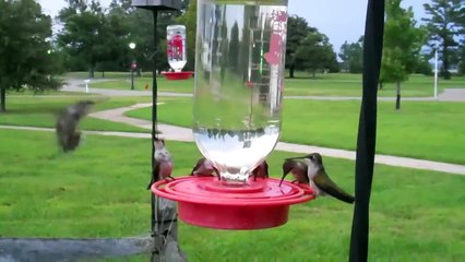 Welcome to our first video. Watch as several Ruby-throated Hummingbirds visit 2 of our feeders in South Jersey. br br Footage shot with a Kodak PixPro AZ528 & a FireFoto AC09. Sound is generic birdsong audio found on Pixabay.