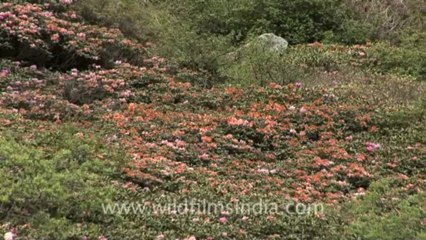 "Dwarf Rhododendrons in Sikkim, India. The slopes of the upper altitudes in Sikkim are carpeted with Rhododendron blossom in the months of May and June, in different shades and hues. Similar species are now found across England the UK, where collectors have brought them back from the Himalaya, for inclusion in botanical gardens and private estate gardens. Flowers in Sikkim. Different varieties of flowers are found in Sikkim. Sikkim is the least populous state in India and the second-smallest state after Goa. The climate ranges from subtropical to high alpine. Sikkim has around 5,000 flowering plants. This footage is part of the professionally-shot stock footage archive of Wilderness Films India Ltd., the largest collection of imagery from South Asia. The Wilderness Films India collection comprises of thousands of hours of high quality broadcast imagery, mostly shot on HDCAM 1080i High Definition, HDV and Digital Betacam. Write to us for licensing this footage on a broadcast format, for use in your production! We pride ourselves in bringing the best of India and South Asia to the world... wfi @ vsnl.com and admin@wildfilmsindia.com.